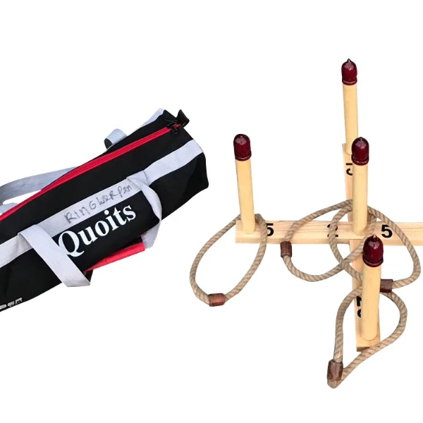 Quoits/Ringwerpen is een traditioneels spel. Ideaal voor liefhebbers van tactiek en techniek.En toch geschikt voor alle leeftijden. Het spel wordt gespeeld door het gooien van een ring. De ring landt op het kruis met 5 palen. Elke paal heeft een waarde. De bedoeling is het afgesproken getal te halen.